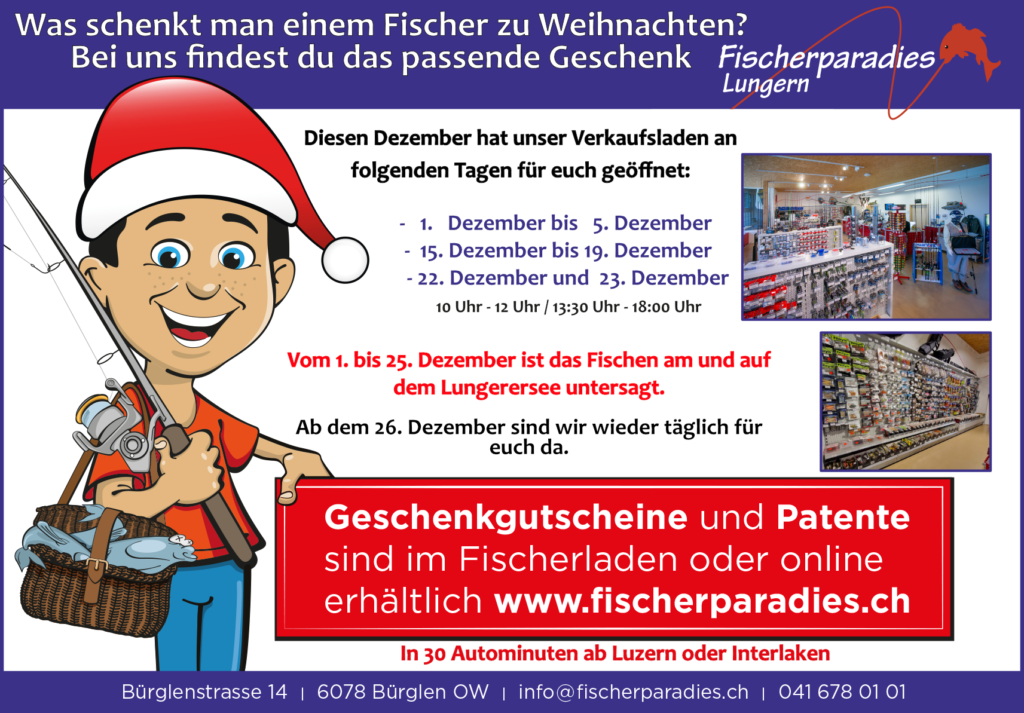 Dieses Jahr haben wir zum ersten Mal unseren Laden während der Betriebsferien geöffnet! Bei uns im Fischerparadies Lungern findest du das perfekte Geschenk für alle Fischereibegeisterten.